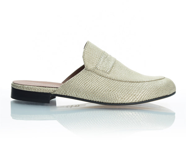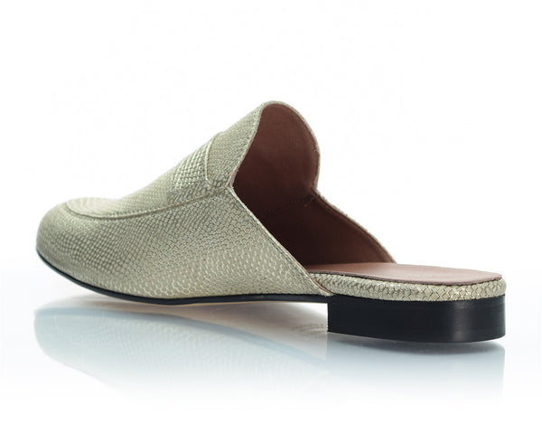 A light gold leather mule, penny loafer accents on top, rounded toe, with a low 1" heel.