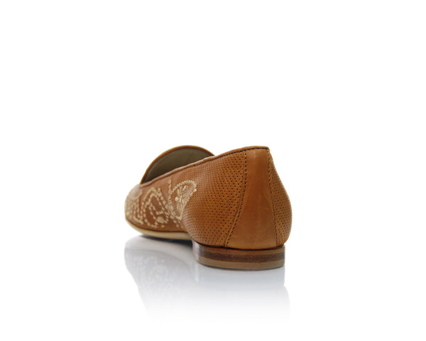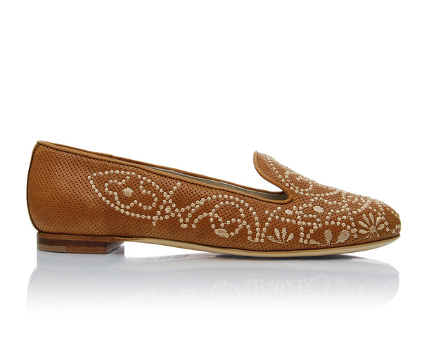 A camel perforated nappa leather loafer with a cream threading that displays a beautiful embroidered pattern throughout the shoe.