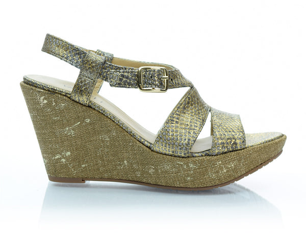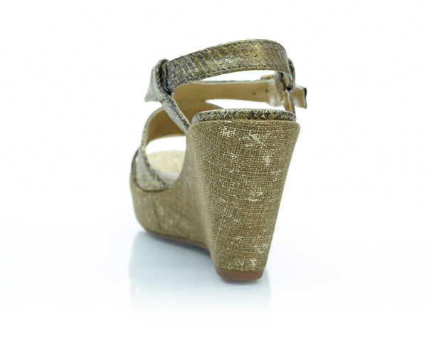 This gold snakeskin embossed leather wedge is a stunner. A 3.5" wedge and 1" platform make this Vaneli wedge super comfy. A gold buckle at the ankle helps make sure you get the best fit possible. You'll be the talk of the town in these gorgeous wedges. Also available in a medium width.