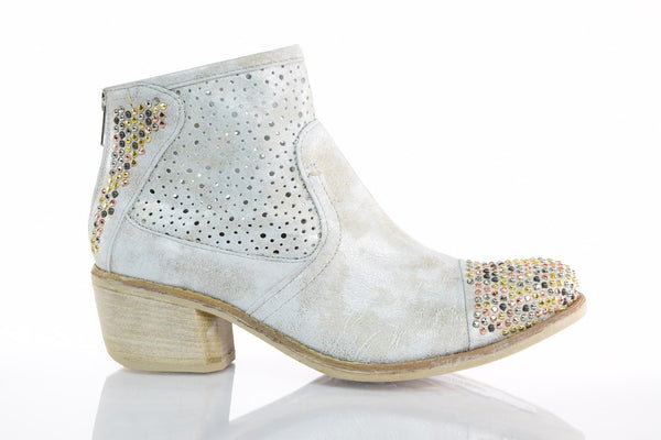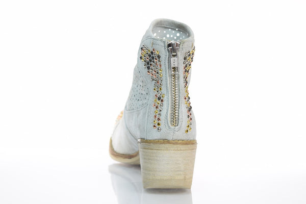 Introducing the perfect summer bootie - multicolored studs, perforated metallic leather, and a stacked 2" heel, what's not to adore? A zipper at the heel makes these western inspired booties a breeze to slip on and off (but who would ever want to take them off?)