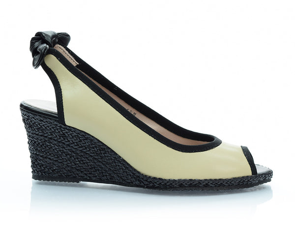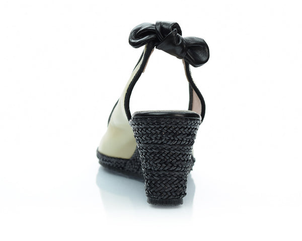 A sling back peep toe wedge in nude leather with black rafia detailing on the 3" wedge. This adorable wedge also features black ribbon trim and a small black leather bow at the heel. Also available in a medium width.