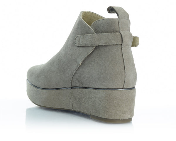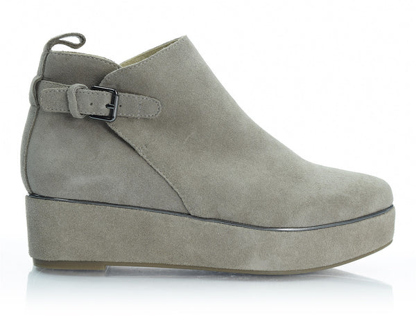 A desert grey suede ankle bootie with a 1" platform, rounded toe, silver pipping accents, and an adjustable buckle
