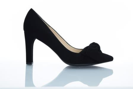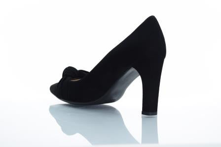 A black suede pump with a bow accent, 3.5" heel, pointed toe