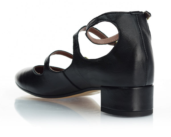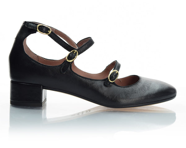 This is a modern twist on your classic Mary Jane. The three cross the foot buckle straps adds an extra dimension to these black leather beauties!