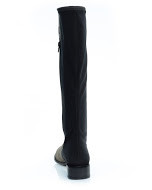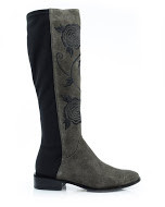 A taupe and black, suede and stretch tall boot with floral embroidery on front of boot and a 1.5 inch stacked heel and a rubber sole.