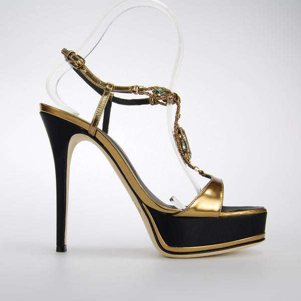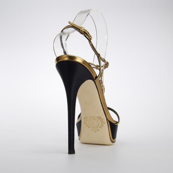 Metallic gold leather sandal with black satin, Swarovski elements, a 1 inch platform and a 5 inch heel.