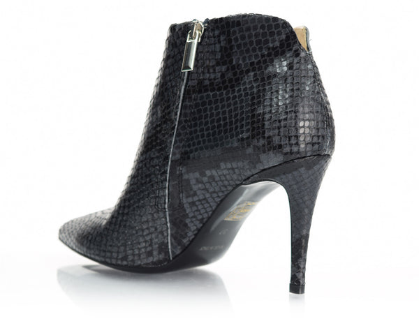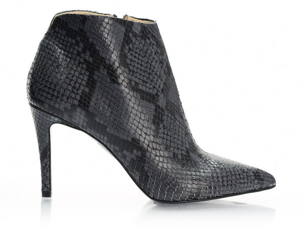 A 3.5" heel Italian leather bootie, pointed toe, grey exotic animal print, zips up the side.