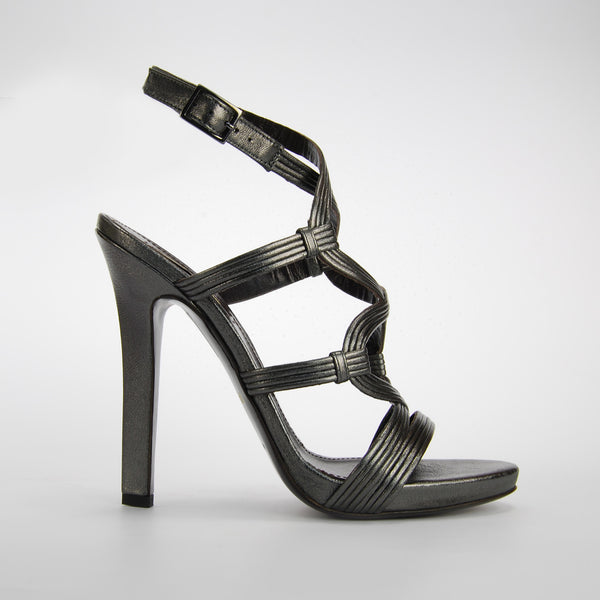 Gunmetal leather strappy sandal with a 5 inch heel.