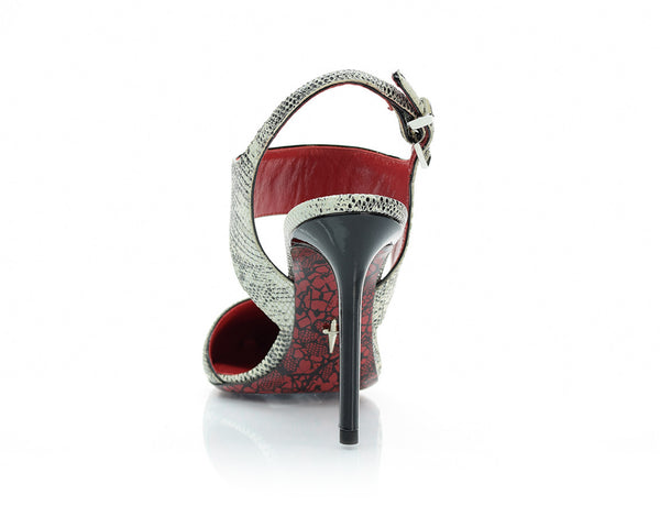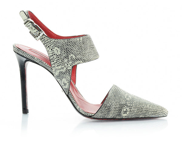 You'll adore the modern structure of these Paciotti pumps. A black 3.5" heel is perfectly complemented by the white and black "lizard" patterned leather. A pointed toe and thick ankle strap give this heel a geometric vibe. Pair with your favorite suit or dress for a look any boss lady will love.