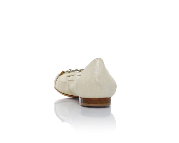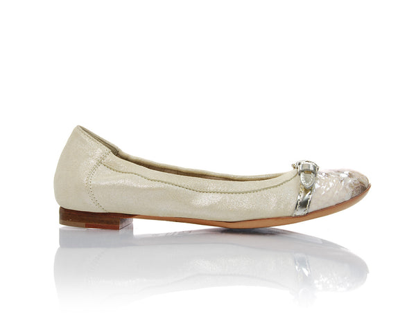 A neutral shimmer suede flat with a silver patent leather strap, a silver chain buckle and an ivory and taupe blended snakeskin toe.