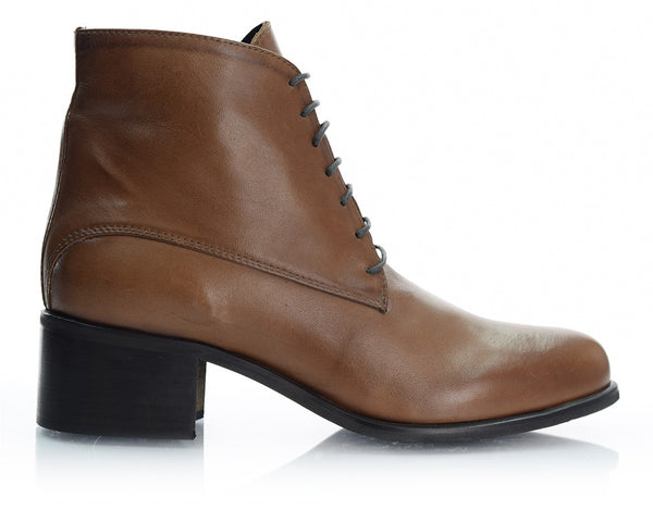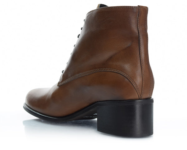 A lace up Italian leather bootie with a low 2" heel and rounded toe.