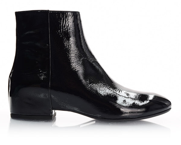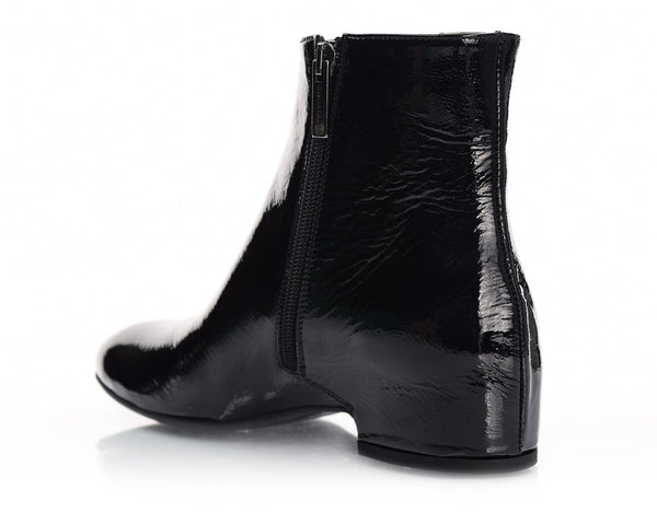 A patent leather bootie with a 1.5 hidden wedge covered in patent leather, zipper side, and rounded toe.