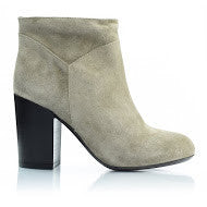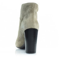 A taupe suede slide-on bootie, 3.25 inch chunky heel, elastic stretch