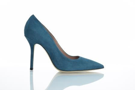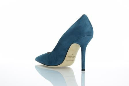 A teal suede pump with 4” heel, pointed toe, and light pink leather lining.