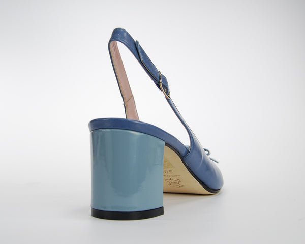 A blue nappa leather slingback with a pale blue bow and toe and a 2 inch chunky heel.