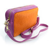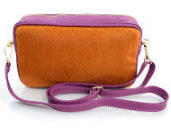 An orange haircalf and purple leather bag featuring gold hardware and an attachable strap. L: 10" H:6" W:3"