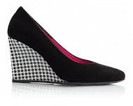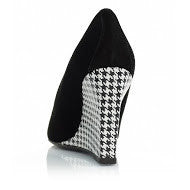 Black suede upper, 3.5 inch houndstooth leather covered heel