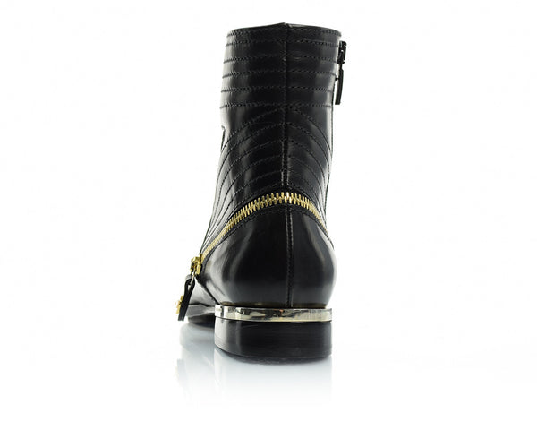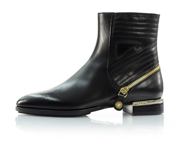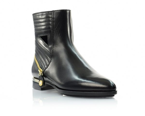 A black nappa leather bootie with a rounded toe, a gold exposed zipper and gold plating on the heel.