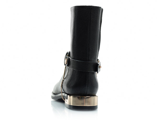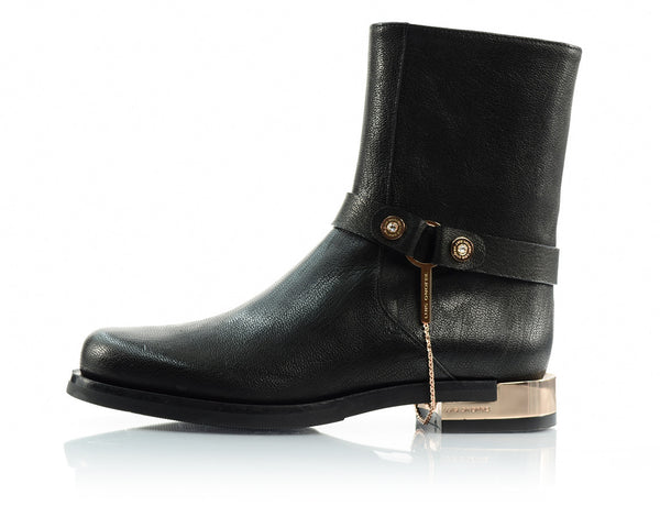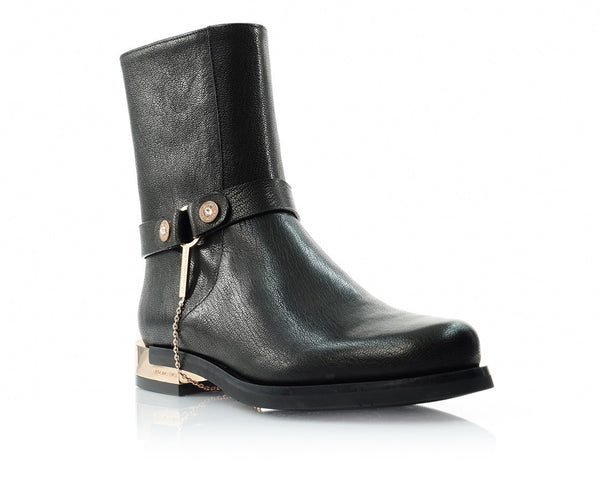 A nappa leather bootie with a round toe and a 1 inch gold plated heel, a black strap with gold and Swarovski elements wraps around the ankle and a delicate gold chain wraps under the boot.