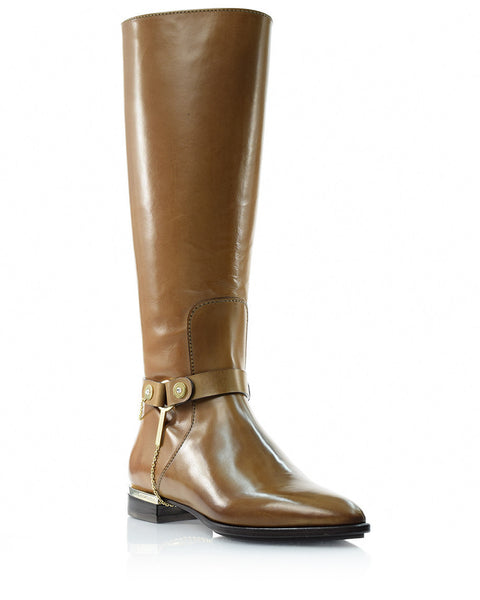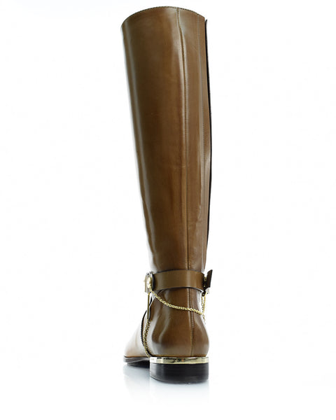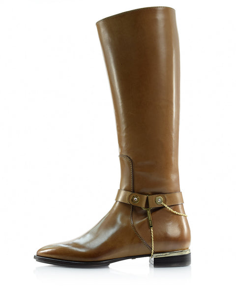 A brown, nappa leather boot with a semi-pointed toe, a 1 inch heel, a strap wrapped around the ankle and small gold accents with Swarovski elements. The back of the boot has a hidden elastic panel that allows for some stretching.