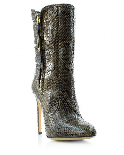 A brown and black python bootie with a rounded toe, an exposed gold zipper on the outer half, a 4 inch heel and a 0.5 inch hidden platform.