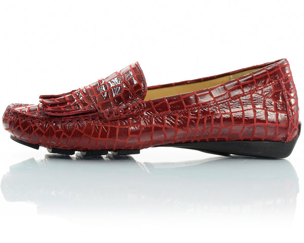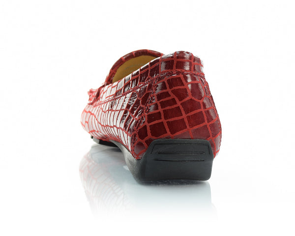 Are you looking for a classic driving moccasin with a twist? This beautiful red crocodile embossed loafer will carry you all over our beautiful city in chic comfort.